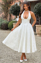 Embrace effortless elegance with the Esmeralda Halter Sleeveless Midi Dress, designed for both sophistication and comfort. Featuring a flattering halter V-neckline and a beautifully textured finish, this dress offers a timeless silhouette. Whether you're attending a special occasion or a chic daytime event, the Esmeralda dress is the perfect choice.