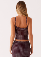 Playful yet poised, the Mira 2-Piece Dotted Ensemble brings a vintage charm to modern minimalism. With its sheer fabric and dainty polka dot print, this two-piece look captures effortless allure for warm-weather soirées.
