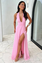 Plunge halter neckline: Draws the eye upward and offers a sculpted, open décolletage.